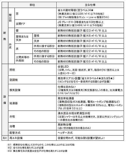 具体的には、断熱性能と省エネ性能を要素ごとに「仕様」によって明示し、わかりやすくした(窓の仕様、断熱材の仕様、照明は「全室LED」、空調機の仕様など)。複数のモデルプランの試算によると、国で定める省エネルギー基準よりも3割程度削減できるという。