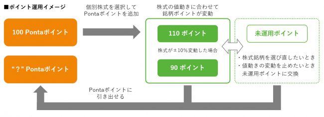 Pontaポイント運用は、選んだ株式銘柄の株価に応じてポイントの価値が変動。口座開設の必要がなく、Pontaポイントを持つPonta会員が利用できる。少額の20Pontaポイントから投資・運用でき、運用中の銘柄をいつでも選び直すことが可能。運用したポイントは、20Pontaポイント単位で引き出すことができ、Ponta提携店舗で利用できる。