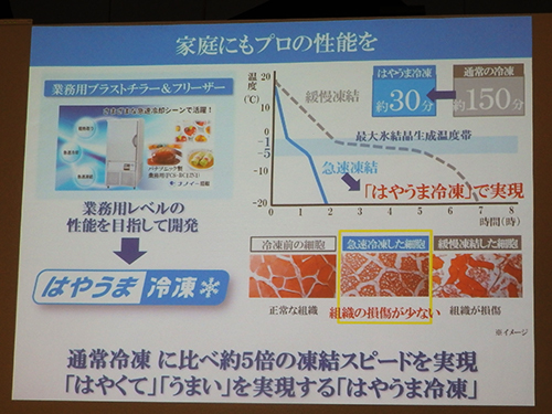 パナソニックの新製品はここに着目し、通常は約150分かかっていた冷凍時間を「はやうま冷凍」として約30分で急速冷凍できるようにした。それが、上から2段目の右側に設置された「クーリングアシストルーム」だ。専用のファンとダクトを設けて、約8倍の大風量で集中冷却することで、食材の細胞組織の損傷を抑える。例えば、揚げ物の場合は食材の水分が衣に移動する前に冷凍させ、ジューシーなまま保存できる、といった効果が得られる。