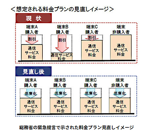 昨年秋の総務省の緊急提言では、想定される料金プランの見直しイメージを図で示した。現状、他社キャリアから乗り換えたときは、端末の月賦をキャッシュバックすることで通信料金を下げているように見えるが、このままでは通信料金は高止まりしたままとなり、頻繁に端末を代えるユーザーは有利に、端末を長く使うユーザーは不利になる。