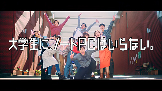 学生生活の先にある社会人になって自分の夢をかなえたり、クリエイティブな想像力を高めたり、アイデアを形にしたりするときのパートナーとして、ノートPCやタブレットが登場するのだ。そして、この映像ディレクターが、現役大学生の清水良広氏というオチをつけながら、「大学生になることが、ゴールの人たちにとっては」スマホだけでもいいだろうが、ノートPCやタブレットを使って自分の能力やアイデアを形にして大学生の殻を破るのもいいのではないかと問題提起する。