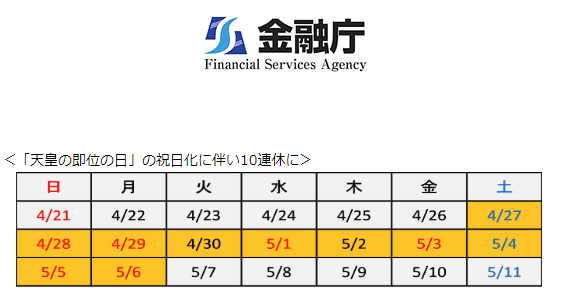 5月1日が、新天皇の即位に伴って平成から新しい元号に変わる「国民の祝日」になったことで、今年のゴールデンウィーク(GW)は4月27日~5月6日まで10連休になる。金融庁は3月25日、多くの金融機関の店舗や窓口業務が休みになることから、口座残高を確認しておくなど余裕をもった対応をするように注意喚起を行った。