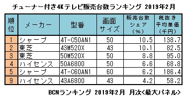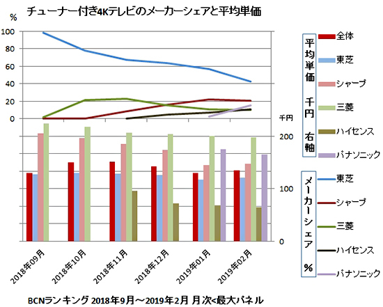 現在、主要メーカーで4Kチューナー搭載テレビを販売しているのは5社。昨年6月に東芝が先行して発売。2018年中に三菱電機、シャープ、ハイセンスの3社が続いた。今年に入りパナソニックも販売を開始し、あとはソニーの発売を待つばかり、という状況だ。2月現在、4Kチューナー付きのテレビ全体の平均単価は13万5000円。チューナーなしでも12万円ちょうどと価格差もごくわずかだ。これから買うならチューナー付き、という流れになっている。