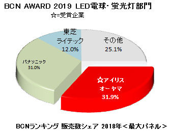 【BCN AWARD 2019・喜びの声】 全国の主要家電量販店・ネットショップのPOSデータを集計した「BCNランキング」のLED電球・蛍光灯部門で、2018年1月~12月の1年間の販売台数シェアNo.1だったメーカーはアイリスオーヤマだった。2014年の同部門創設からパナソニックの首位だった牙城を切り崩した。石垣達也 家電事業部 統括事業部長に喜びの声を寄せてもらった。