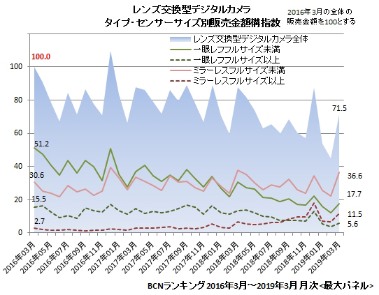 一眼レフの販売縮小が激しい。2016年3月のレンズ交換型デジタルカメラの販売金額を100とする指数を見ると、この3月、全体では71.5とおよそ3割の減少だが、一眼レフでは販売金額が6割以上も減少した。特に、昨年春以降の雪崩を打ったような下落の状況は「一眼レフの終焉」が近いことを示している。構成比でも同様だ。3年前、レンズ交換型デジタルカメラで販売金額に占める割合は66.7%と7割近かった。しかしこの3月では、急速に伸びているミラーレス一眼に押されて32.7%と半減。センサーサイズ別に見ても、一眼レフはフルサイズ以上・未満とも構成がほぼ半減した。トップシェアメーカーのキヤノンと、追うニコンで9割超のシェアを占める一眼レフ市場だが、両社ともに新しいマウントでミラーレス一眼に舵を切った。この影響もあり、フルサイズのミラーレス一眼の構成比は16.1%と3年前のおよそ6倍の構成比に拡大した。まだ2割には届かないが、存在感は着実に増している。