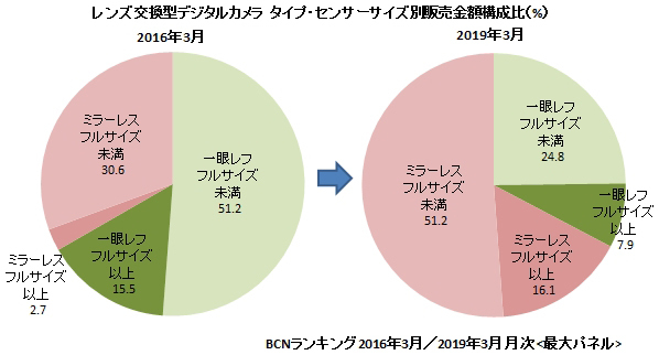 市場の主役をミラーレス一眼に明け渡したとはいえ、一眼レフは多くのユーザーと豊富な交換レンズのラインアップを抱えている。依然3割超の売り上げを稼ぎ出すセクターを、これからどうするかは悩ましい問題だ。報道機関などのプロニーズが期待できるフラッグシップモデルと現在開発中の機種を除いて、新たな開発は難しいだろう。レンズも同様で、今後は徐々にフェードアウトさせることになりそうだ。市場にとっては、どうやって一眼レフを穏便に「殺し」ミラーレス一眼をさらに加速させるかが大きなポイントだ。3月現在、レンズ交換型デジタルカメラ市場の販売金額で51.2%と過半を占めているのはフルサイズ未満のセンサーを搭載したミラーレス一眼で税抜き平均単価はおよそ8万円。レンズ交換型デジタルカメラ最大のボリュームゾーンだ。ここのラインアップ増強がレンズ交換型デジタルカメラ市場の維持にとって極めて重要になってくる。
