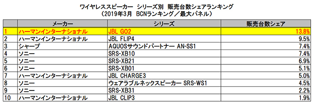 最大10連休のGW(ゴールデンウィーク)に向けて準備を進めている人におすすめしたいのが、アウトドアレジャーの定番として存在感を高めているワイヤレススピーカーだ。性能や機能だけでなくデザインも重要な購入基準となるワイヤレススピーカーは、豊富なカラーバリエーションを揃えるモデルが人気を集めている。全国の家電量販店やECショップでPOSデータを集計する「BCNランキング」によると、19年3月のシリーズ別販売台数ランキングは以下の通り。