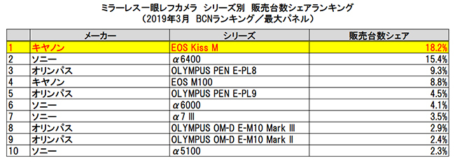 キヤノンの「EOS RP」は3月14日発売なので、約半月でベストテンを射程に収めたことになる。GW中にも最大の目玉となるはずだ。また、5月後半にはパナソニックのハイアマチュア向けモデル「G99」シリーズの発売も控える。一眼レフユーザーが、ミラーレスにシフトするというケースもこれから増えてきそうだ。(BCN・大蔵 大輔)
