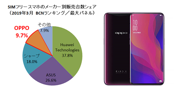 全国の家電量販店やECショップでPOSデータを集計する「BCNランキング」によると、SIMフリースマホの販売台数シェア(2019年3月)は9.7%で、参入以来の最高値を更新。黎明期から市場のメインプレーヤーとして君臨しているファーウェイ、ASUS、シャープに次ぐ4番手につけている。成長率ではもっとも勢いのあるメーカーといえるだろう。