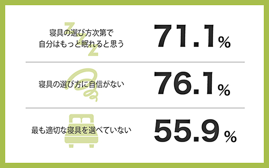 寝具に関する質問では、71.1%が「寝具の選び方次第で自分はもっと眠れると思う」と答えたものの、「寝具の選び方に自信がない」(76.1%)、「最も適切な寝具を選べていない」(55.9%)という回答も多かった。