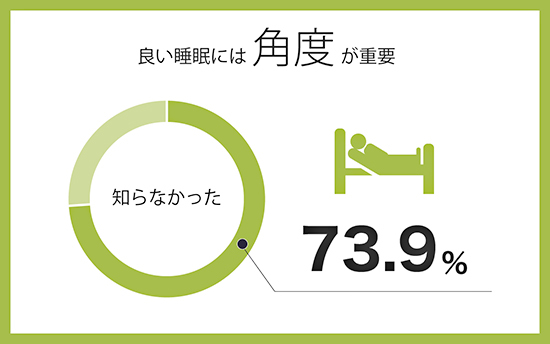 睡眠時、仰向けに寝て上半身を起こす(背に角度をつける)ことで、重力によって横隔膜の広がりが大きくなって呼吸しやすくなり、身体がリラックスして入眠時によい影響が生まれると考えられているが、調査では73.9%が、「知らない」と回答。「よい睡眠には角度が重要」だと、多くの人が知らないことが明らかになった。