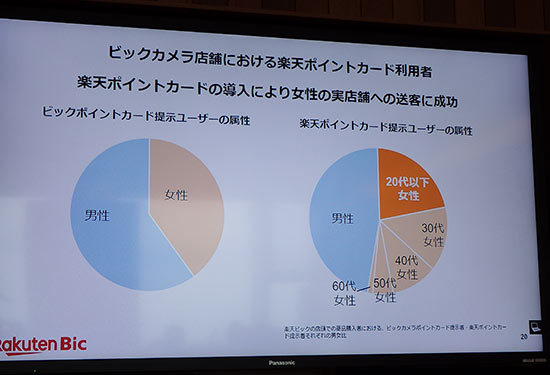 店舗における楽天ポイントカード利用者を分析したところ、ビックポイントカードを提示したユーザーは男性の方が半数を上回ったのに対し、楽天ポイントカードを提示したユーザーは女性客が半数以上を占め、その中でも20代以下の女性の比率が高いことが分かった。