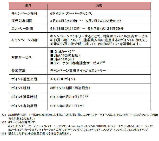 NTTドコモは、スマートフォンを利用したモバイル決済サービス「d払い」、電子マネー「iD(dカード)」で決済すると、通常購入時に付与するポイントに加え、買い物金額の20%のdポイント(期間・用途限定)を後日還元するキャンペーンとして、「dポイント スーパーチャンス」を4月24日0時~5月7日23時59分に開催する。事前エントリーが必須で、4月18日から専用サイトで受け付ける。