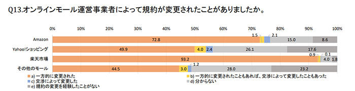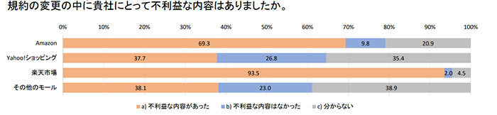 変更された規約の中に自社に「不利益な内容があった」と回答したのは、楽天市場が93.5%、アマゾンが69.3%、ヤフーショッピングが37.7%となり、多くの出品業者が不満を抱える衝撃的な内容だった。
