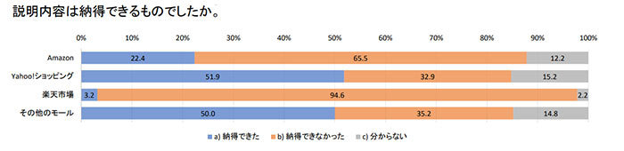 ただし、その説明内容に納得できたかどうかについて聞いたところ、「納得できなかった」が楽天市場では94.6%、アマゾンは65.5%、ヤフーショッピングは32.9%となり、やはり楽天市場が突出する結果になっているのだ。