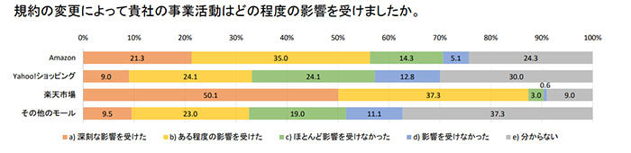 同じく、規約の変更を経験したことがない業者に事業活動への影響を聞くと、「深刻な影響を受けた」は楽天市場が50.1%、アマゾンが21.3%、ヤフーショッピングが9.0%となった。