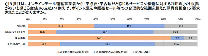 「要求されたことがあった」と回答したのは楽天市場が84.2%、アマゾンが38.7%、ヤフーショッピングが16.8%となっており、ここでも楽天市場が突出した。
