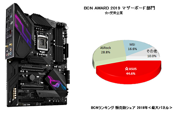 【BCN AWARD 2019・喜びの声】 全国の主要家電量販店・ネットショップのPOSデータを集計した「BCNランキング」のマザーボード部門で、2018年1月~12月の1年間の販売台数シェアNo.1だったメーカーはASUS JAPAN。同社の受賞は14年連続16回目。過半数に迫る圧倒的シェアで、No.1に輝いた。受賞に際して、OPビジネス部 コンシューマ事業部 榮花岳雄部長にコメントを寄せてもらった。