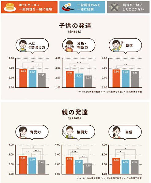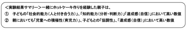 今回、約500人の子ども(年長~中学2年生)のいる母親を対象にアンケートを実施した結果、ホットケーキ作りを経験した親子は、全く調理経験がない、もしくは一般調理のみ経験したことがある親子に比べ、子どもの社会的能力(人と付き合う力)、知的能力(分析、判断力)、達成感(自信)とも、それぞれ高い数値を示した。ホットケーキ作りは子どもにとって自立的な態度、行動を促し、計画性、適切な判断力、自制心、想像力が育まれるだけではなく、親側も子どもに教えて任せることで育児力や協調力が向上し、相乗効果が期待できるといえる。