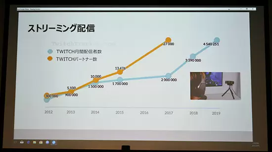 いまやYouTubeユーザーの人口は約15億人。世界中の誰もが気軽に動画を配信できる環境ができつつある。室井氏は、ストリーミング人口が急増している数値の根拠として、代表的な動画配信サービスであるTwitchiの月間配信者数の推移も紹介。直近2年で200万人から約450万人に増加しており、動画配信の文化がワールドワイドで急速に浸透してきていることが分かる。