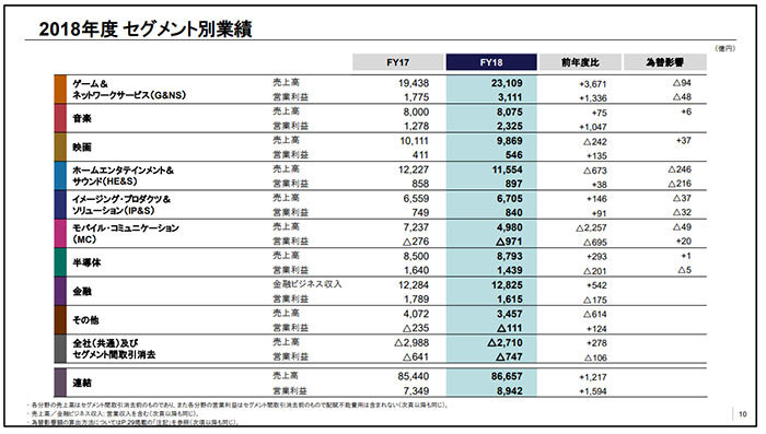 一方、同分野の19年度は、売上高がほぼ前年並みの2兆3000億円(0.5%減)で、営業損益は2800億円(10.0%減)の減益になる見通しだ。理由について、十時裕樹専務CFOは「次世代ゲーム機の開発にかかる費用の増加や収益性の高い自社制作ゲームソフトウェアの貢献度の減少がある」と述べた。