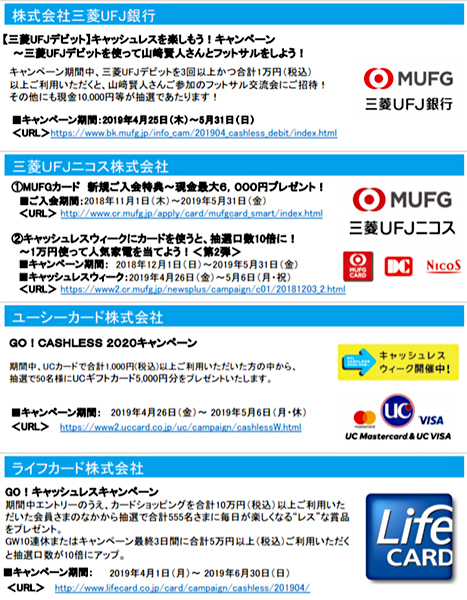 三菱UFJ銀行が山﨑賢人さんとフットサル、三菱UFJニコスが新規入会とカード利用の二つで得するキャンペーンを実施している。ユーシーカードは、UCギフトカード5000円分をプレゼント。ライフカードは、抽選で555人に毎日が楽しくなる“レス”な賞品を提供する。