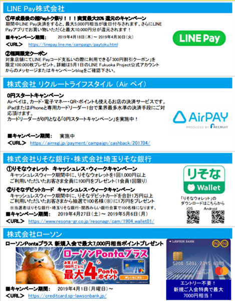 LINE Payは、「平成最後の超Payトク祭り」で実質最大20%を還元。リクルートライフスタイルは、「Airペイ」でカードリーダーが0円となる「0円スタートキャンペーン」を実施中だ。りそな銀行と埼玉りそな銀行は、1回1000円以上で「りそなウォレット」を利用すれば全員に100円をプレゼント。ローソンは、「ローソンPontaプラス 新規入会で最大7,000円相当ポイントプレゼント」を実施している。
