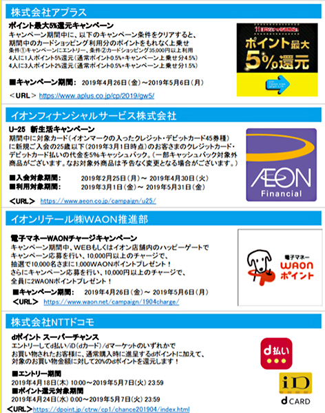 アプラスは、「最大5%還元キャンペーン」を実施。イオンフィナンシャルサービスは、新生活に向けたキャンペーンで5月31日までの開催だ。イオンリテールは、電子マネー「WAON」で1万円以上をチャージすると抽選で1000WAONポイントをプレゼントする。NTTドコモは、対象の買い物金額に対して20%のdポイントを還元する。