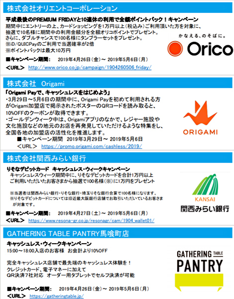オリエントコーポレーションは、「平成最後のPREMIUM FRIDAYと10連休の利用で全額ポイントバック!キャンペーン」で最大10万円をポイントバック。Origamiは、「Origami Payで、キャッシュレスをはじめよう」を実施している。関西みらい銀行は、りそなデビットカードで合計1万円以上を利用すれば抽選で100人に1万円をプレゼント。GATHERING TABLE PANTRY馬喰町店は、5月6日まで15~18時の来店で会計が10%オフとなる。