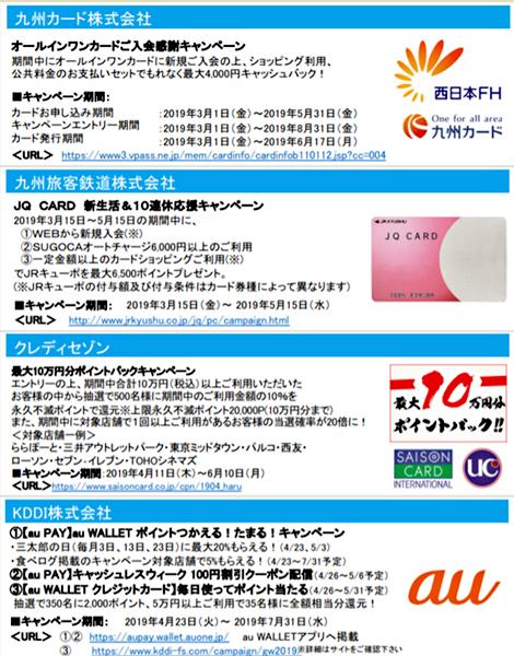 九州カードは、「オールインワンカードご入会感謝キャンペーン」で最大4000円をキャシュバック。九州旅客鉄道(JR九州)は、「JQ CARD 新生活&10連休応援キャンペーン」を5月15日まで実施している。クレディセゾンは、最大で10万円分のポイントバック。KDDIは、「au PAY」で最大20%もらえるなどを行っている。