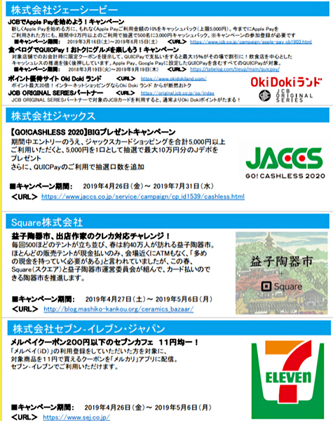 ジェーシービーは、Apple Payの利用を促すキャンペーンなどを実施。ジャックスは、5000円を1口に抽選で最大10万円分のJデポをプレゼントする。Squareは、現金払いが主流の益子陶器市でカード払いを推進。セブン-イレブン・ジャパンは、対象商品11円で買えるクーポンを「メルカリ」アプリに配信する。