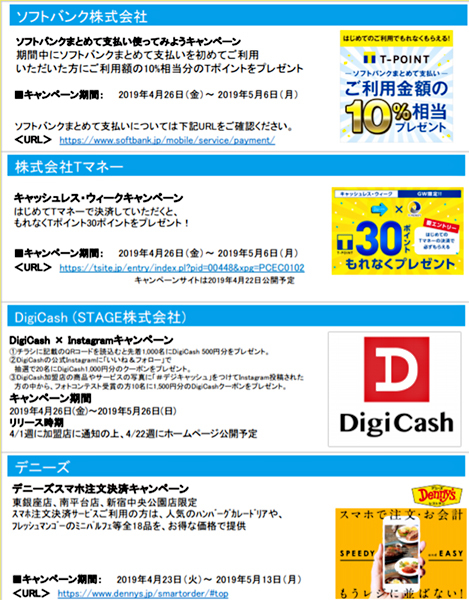 ソフトバンクは、「まとめて支払い」を初めて利用すれば利用額の10%相当分のTポイントをプレゼント。Tマネーは、初めてのTマネー決済でTポイント30ポイントを配布。DigiCashは、「DigiCash×Instagramキャンペーン」を実施している。デニーズは、東銀座店、南平台店、新宿中央公園店の限定でスマートフォン決済による特別価格を提供している。