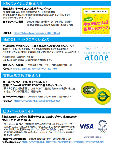 トヨタファイナンスは、「始めよう!キャッシュレス生活キャンペーン」を実施。ネットプロテクションズは、「atone」でクレジットが無くてもキャッシュレス化を実現することをアピール。東日本旅客鉄道(JR東日本)は、JRE POINTに登録したSuicaで買い物するとポイント15倍。ビザ・ワールドワイドは、「東京2020オリンピック 観戦チケット& Visaオリジナル 東京2020オリンピック グッズが当たる!」を実施している。