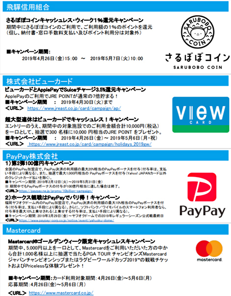 飛騨信用組合は、さるぼぼコインの利用で利用額1%ポイントを還元。ビューカードは、Apple Payの利用でJRE POINTが通常の7倍となる。PayPayは、「第2弾100億円キャンペーン」に加えて「ホークス観戦はPayPayでバリ得!キャンペーン」も実施している。Mastercardのキャンペーンは、抽選でPGA TOURチャンピオンズ「Mastercard Japan Championship」や「ラグビーワールドカップ2019」の観戦チケットが当たる。