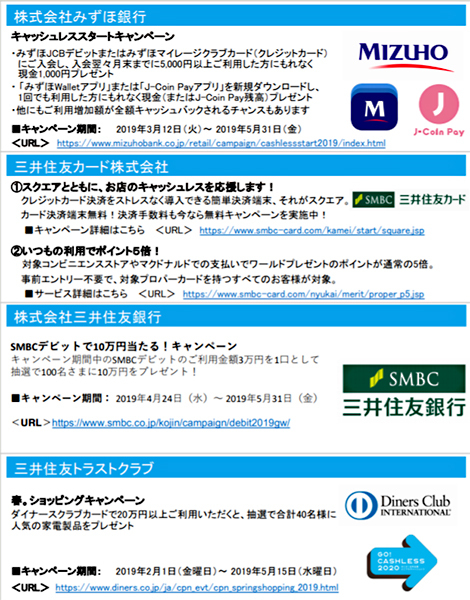 みずほ銀行が「キャッシュレススタートキャンペーン」、三井住友カードがいつもの利用でポイント5倍、三井住友銀行が「SMBCデビットで10万円当たる!キャンペーン」、三井住友トラストクラブがで20万円以上の利用で40人に人気の家電製品が抽選で当たるキャンペーンを実施。