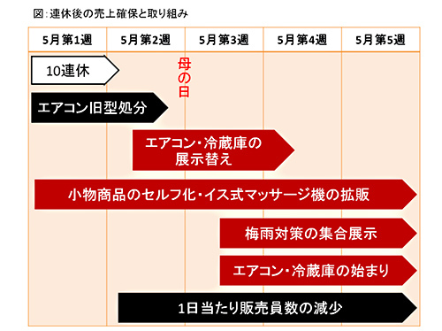 少ない人員で売上高を確保しなくてはならない今年は特に、6月から本格的に動き出す冷蔵庫とエアコンの売り場を、夏商戦前の早くからつくって、前倒しで販売する必要があるだろう。
