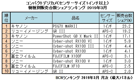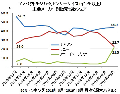 スマートフォン(スマホ)と存在を賭けた争いを続けているコンパクトデジカメは、市場全体で台数が前年と比べて2割以上のマイナスという状況が続いており、縮小が著しい。しかし、1インチ以上の大きなセンサーを搭載したモデルは前年を上回る月も珍しくなく、過去12カ月のうち7カ月は前年を上回った。特に、この3月は122.5%と前年を大幅に上回った。メーカー別でこの1年ほど1インチ以上のコンパクトデジカメ市場は、キヤノンとソニーの一騎打ちの様相を呈していた。キヤノンは安定的に強さを維持しているが、ソニーはGR III発売効果でシェアを一気に食われ、リコーが1.2%差のところまで迫っている。