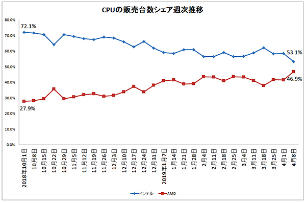 4月1日に既報した通り、インテル製CPUのひっ迫に起因するAMDのシェア上昇は今も続いている。全国の主要家電量販店・ネットショップのPOSデータを集計した「BCNランキング」週次データ(2018年10月1日週~19年4月8日週)によれば、パーツ単体としてのAMD製CPUの販売シェアは、直近の4月8日週では46.9%と、ここ半年では最大値を記録。インテルに肉薄する動きとなっている。