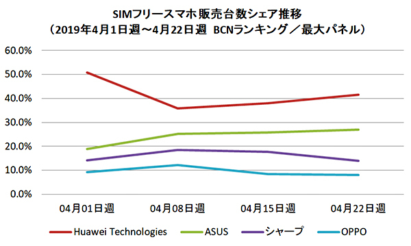 メーカー別販売台数シェアでも、ファーウェイは4週連続でトップ。第1週に過半数のシェアを獲得、その後はやや下げたが40%前後の高いシェアを維持した。2位のASUSは「ZenFone Max Pro(M2)」の不具合に伴う販売停止の影響で、月初にシェアが失速。中旬以降は、1万円台の格安モデル「ZenFone Live(L1)ZA550KL」やミドルレンジモデル「ZenFone Max(M2)」が健闘し、20%後半まで戻した。