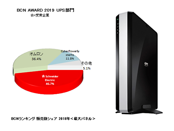 【BCN AWARD 2019・喜びの声】 全国の主要家電量販店・ネットショップのPOSデータを集計した「BCNランキング」のUPS部門で、2018年1月~12月の1年間の販売台数シェアNo.1だったメーカーは、シュナイダーエレクトリック。46.7%という高シェアで4年連続の受賞となった。来るIoT時代や東京五輪に向けて需要の増加が見込まれる同分野でいかにトップを維持していくのか。IT事業部 パートナー営業部 副本部長 兼 西日本統括の城剛史氏にコメントを寄せてもらった。