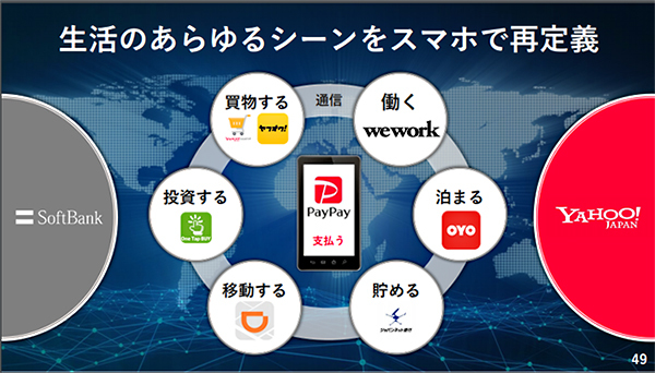 記者会見では、ソフトバンクの成長に向けた次の一手として、ヤフーの連結子会社化は目玉施策として紹介された。示されたチャートには、スマホ決済のPayPayを中心に、取り囲むようにソフトバングが注力している非通信事業のコワーキングスペースのweworkやAI配車プラットフォームのDiDi、ホテル事業のOYO Hotels Japan、スマホ証券のOne Tap BUYのほか、ヤフーのオークションサイトであるヤフオク、ジャパンネット銀行などが並ぶ。