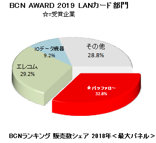 【BCN AWARD 2019・喜びの声】 全国の主要家電量販店・ネットショップのPOSデータを集計した「BCNランキング」のLANカード部門で、2018年1月~12月の1年間の販売台数シェアNo.1だったメーカーは、メルコホールディングスの中核企業のバッファローだった。同部門では20年連続トップの金字塔を打ち建てた。