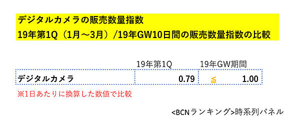 唯一、コンパクトデジカメ、一眼レフ・ミラーレス一眼を合わせた「デジタルカメラ」だけは前年を下回り、販売数量の減少に歯止めがかかっていない状況が明らかになった。とはいえ、GW10日間の1日あたりの平均販売台数は、今年1月~3月の平均を上回っており(プラス0.21ポイント)、10日間にも及ぶ長い連休は、短期的な売れ行きという観点では、カテゴリーを問わず、プラス効果があったといえるだろう。なお、他の4カテゴリーも、軒並みGW10日間の1日あたりの平均販売台数は、今年1月~3月の平均を上回っていた。
