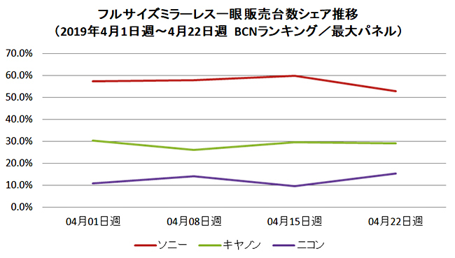 プレイヤー増加が市場活性化のトリガーになっているが、圧倒的シェアを確保しているのは以前から市場をけん引してきたソニーだ。4月各週の販売台数シェアは50%後半をキープ。以下はキヤノンが30%前後、ニコンが15%前後で続く。単月でみればソニー優位は歴然だが、同社のシェアは昨年末は60%を常に超えており、各社の差は徐々にではあるが、詰まりつつあるともいえる。