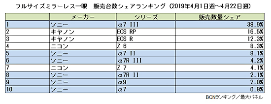 シリーズ別販売台数シェアでは、ソニーの「α7 III」が38.9%で1位。2位は3月に発売されたキヤノンの「EOS RP」で、シェアは16.5%。上位モデルの「EOS R」も12.3%で3位と健闘している。