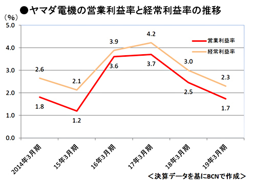 ヤマダ電機の過去6年間の営業利益率の推移をみると、15年3月期の1.2%を底に16年に3.6%、17年に3.7%と盛り返したが、それ以降は再び下降している。経常利益率もほぼ同じトレンドで推移していることが分かる。