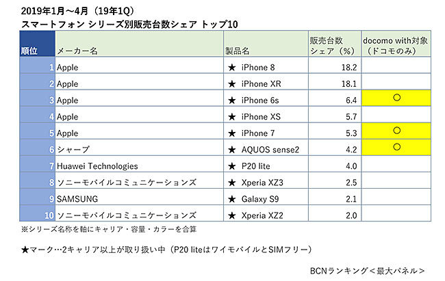 「BCNランキング」によると、今の売れ筋は、18年10月発売の「iPhone XR」と17年9月発売の「iPhone 8」だが、2月~4月は、Y!mobile(ワイモバイル)、UQ mobileの主力機種「iPhone 7」もそこそこ売れていた。またドコモは、2月27日にdocomo withの対象機種に「iPhone 7」を追加。その結果、ドコモ版「iPhone 7」の販売台数は3月・4月は急に跳ね上がった。