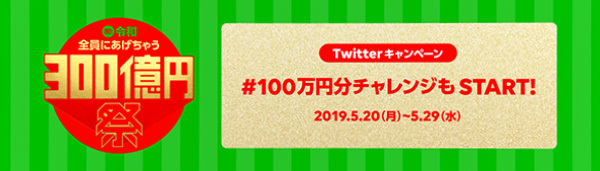 LINEとLINE Payは、5月20日に開始した「祝!令和 全員にあげちゃう300億円祭」で、ダブルチャンス企画として「LINE」の友だち10人に1000円相当の「LINE Pay ボーナス」を送った後にハッシュタグをつけてつぶやくと、抽選で10人に「LINE Pay ボーナス」100万円分をプレゼントするTwitterキャンペーンを同時に開催した。