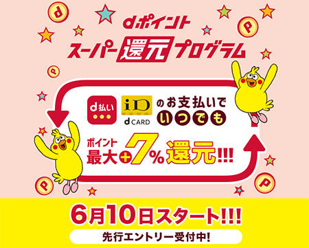 6月10日9時にスタートする「dポイント スーパー還元プログラム」は、ドコモユーザーを中心とする「dポイントクラブ」会員向けの新たなプログラムで、エントリーしたうえで、スマートフォン決済サービス「d払い(街のお店)」または非接触決済の「iD(dカード)」で決済すると、通常付与するポイントに加え、買い物金額の最大7%分を、dポイント(期間・用途限定)で還元する。