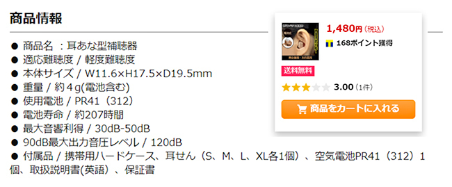そもそもこの時点で、販売側が補聴器と集音器を(意図してか、意図せずか)混合させていることがよく分かる。もっと悪質なものでは、製品名に「補聴器」としか表記していないにもかかわらず、実際は「集音器」という出品もあった。